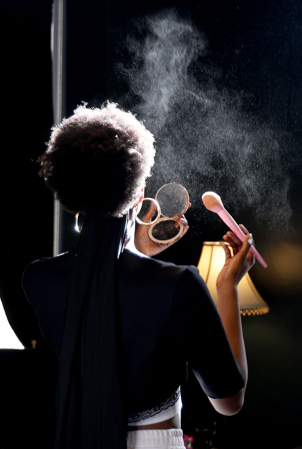 Model Trinity Reese, 24, touches up her makeup before Anton & Maxine’s fashion show “En-Cloth-Sure No. 2.” Photo by Julia Moulton/The Carolina Reporter