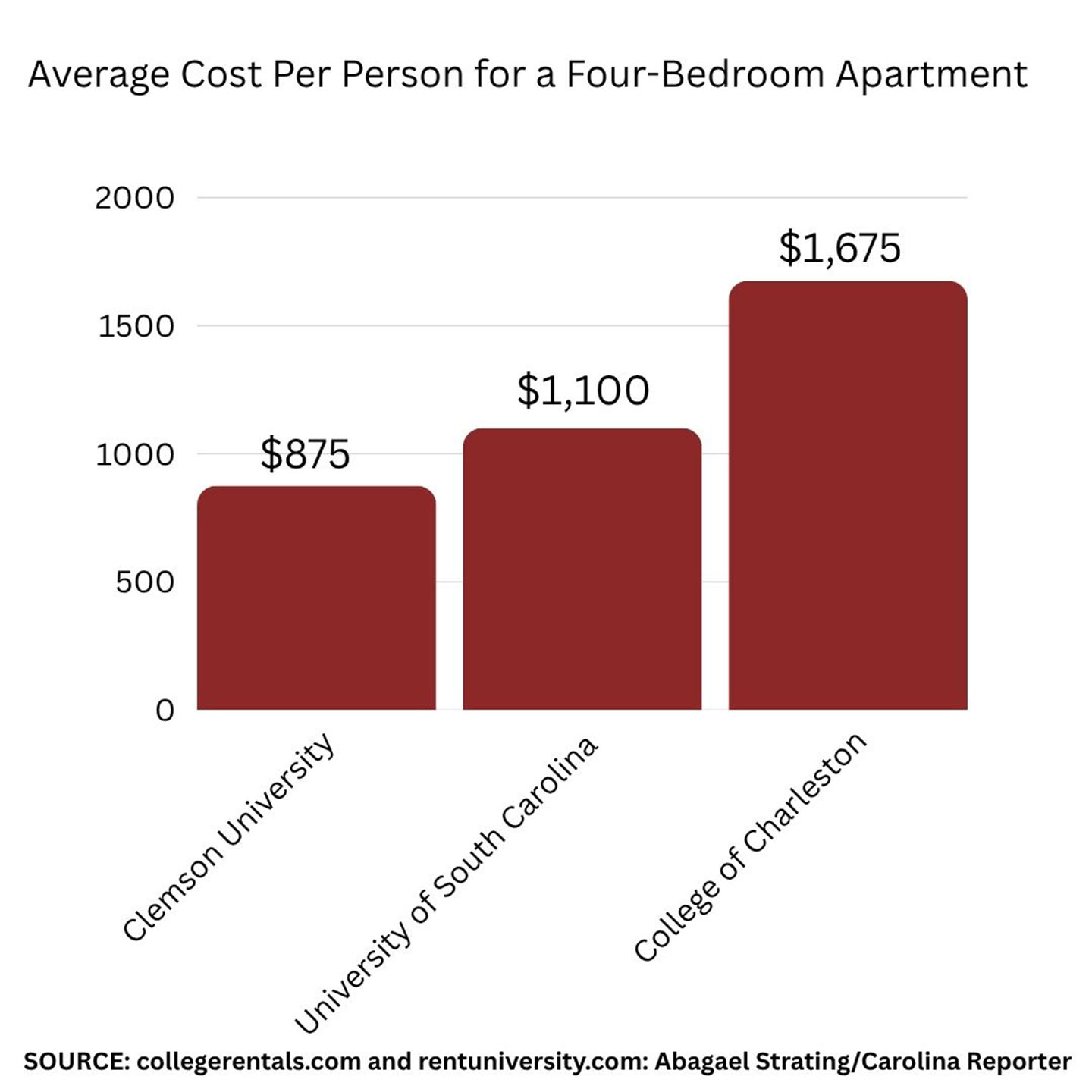 Clemson University and College of Charleston are not too far off. Clemson’s average rate for a student in a four-bedroom apartment is around $750 to $1,000, while the College of Charleston’s is $1,500 to $1,850.