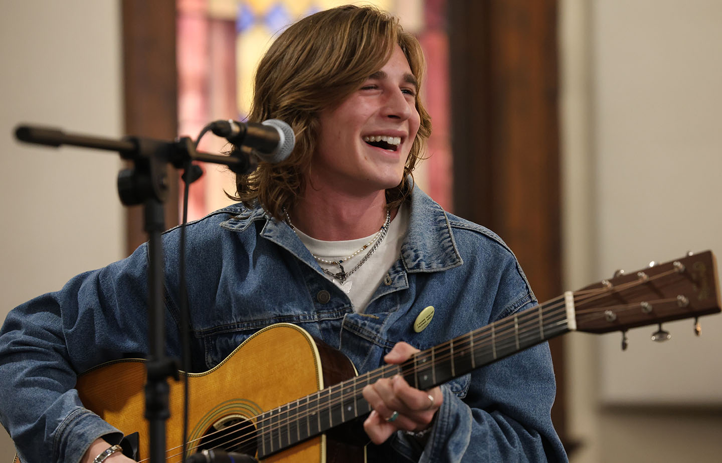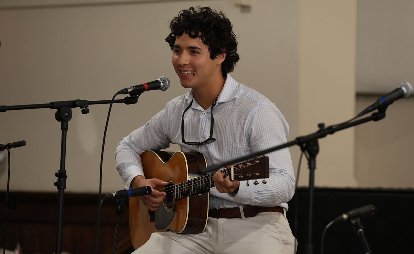 USC finance student David Henao wanted The Runarounds to listen to a demo he made and ask them if they needed openers for their tour. They did him a solid and let him get on stage right away to play a cover of a song in front of everyone at the event. Photo by Ansley Peterson/Carolina Reporter