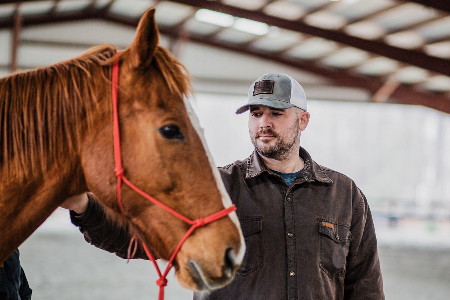 A Warrior PAATH participant becomes acquainted with one of the program’s horses. Photo courtesy of Big Red Barn Retreat/Carolina Reporter
