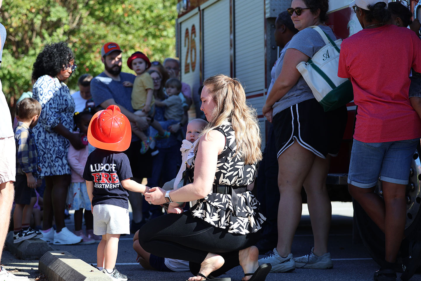 Two-year-old Bryson McDougall and his mom Mary McDougall attend the “Meet a Firefighter” event. Bryson, who wants to be a firefighter for Halloween, came to the event dressed in costume. Photo by Katie Cannon/Carolina Reporter