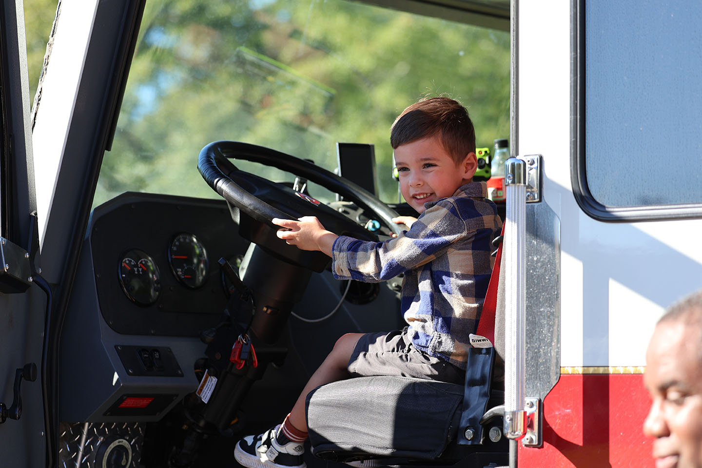 Three-and-a-half-year-old Nile Brown takes the wheel of the Blythewood Station 26 firetruck during the “Meet a Firefighter” event at the local Richland Library. Photo by Katie Cannon/Carolina Reporter