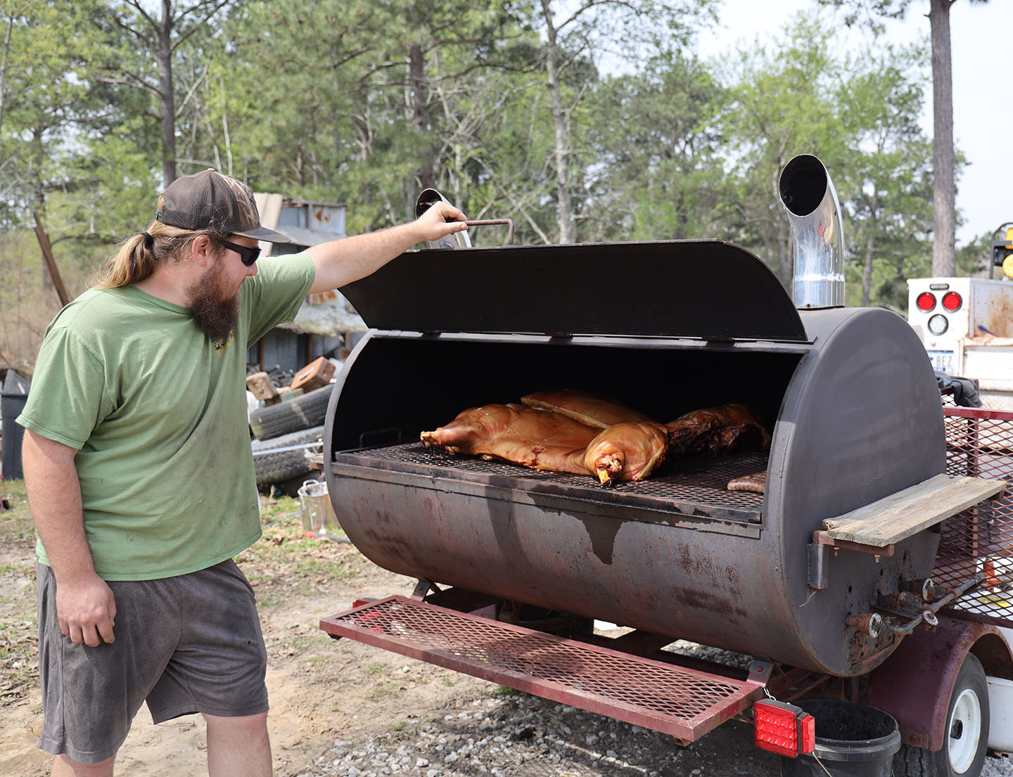 Michael Clayborne roasts a hog in a steamer for his father’s 76th birthday celebration. Photo by Camille Molten/The Carolina Reporter
