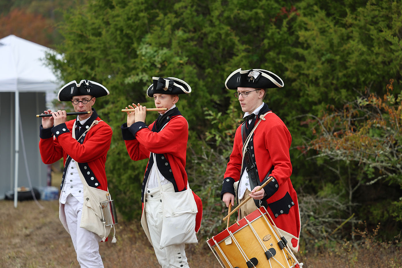 Daniel Alston, Cade Clark and Matthew Slade perform music with two fifes and drums. Photo by Miles Shea/Carolina Reporter