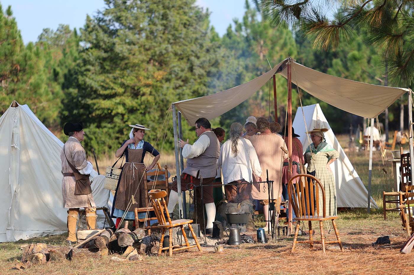 Reenactors congregate under a tent. Photo by Miles Shea/Carolina Reporter