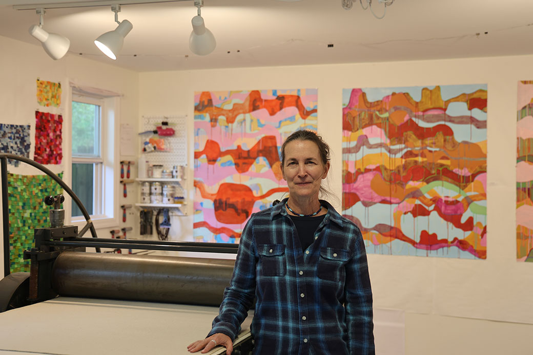Printmaker Mary Robinson opened her backyard studio off Rosewood Drive, where her mixed-media works combine repurposed cloth and paper. Each piece is dyed, printed, collaged, pieced and woven by hand.