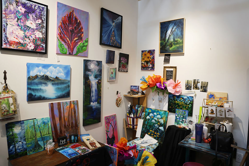 Gemini Studios offers both private and shared workspaces, along with rotating exhibitions and community classes. One current show draws inspiration from Georgia O’Keeffe’s floral works.