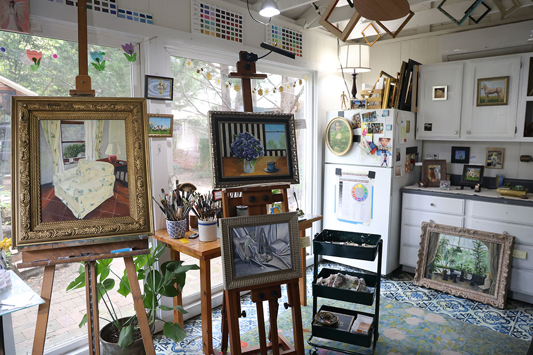 Kathy Love and Brent Girard display art at their shared workspace. Photo by Julia Moulton/The Carolina Reporter