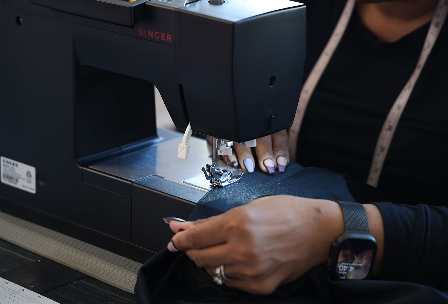 Designer Stoi Galindez works carefully at her sewing machine, bringing one of her custom creations to life. Photo by Morgan Kozak/Carolina Reporter