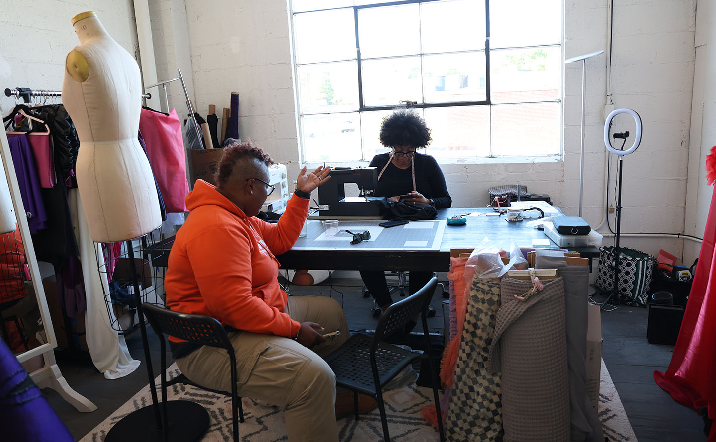 CEO Soul Renée, left, and designer Stoi Galindez collaborate amid a flurry of fabrics, tools and creative energy. Photo by Morgan Kozak/Carolina Reporter