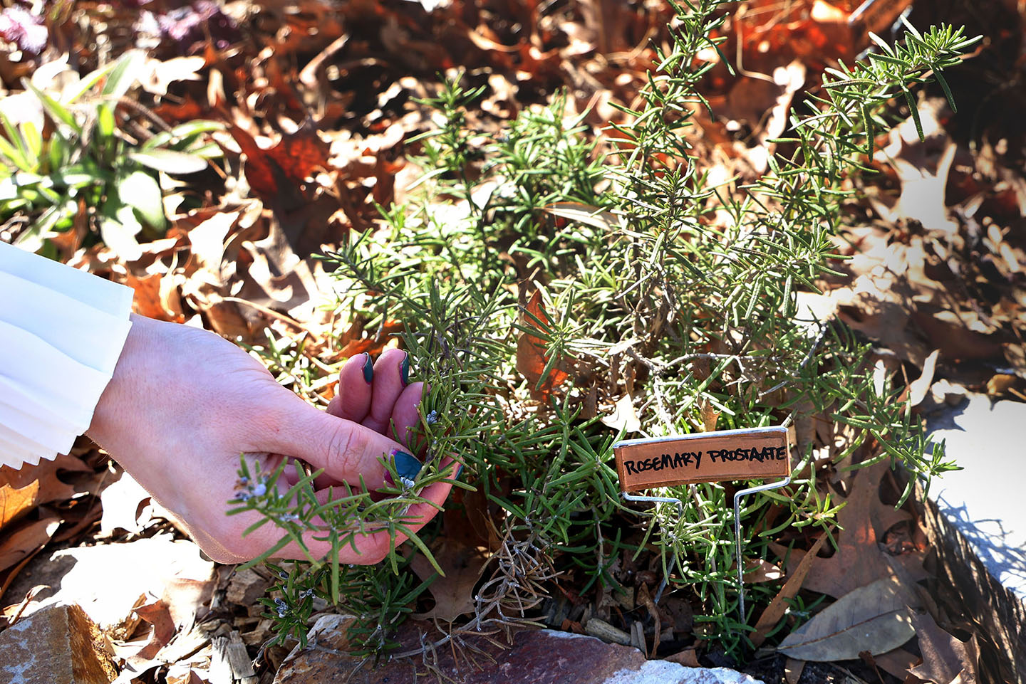 Cecilia Stucker, Five Points’ beautification manager, shows off the early spring budding of rosemary, a first step in new landscaping initiatives. Photo by Julia Moulton/The Carolina Reporter
