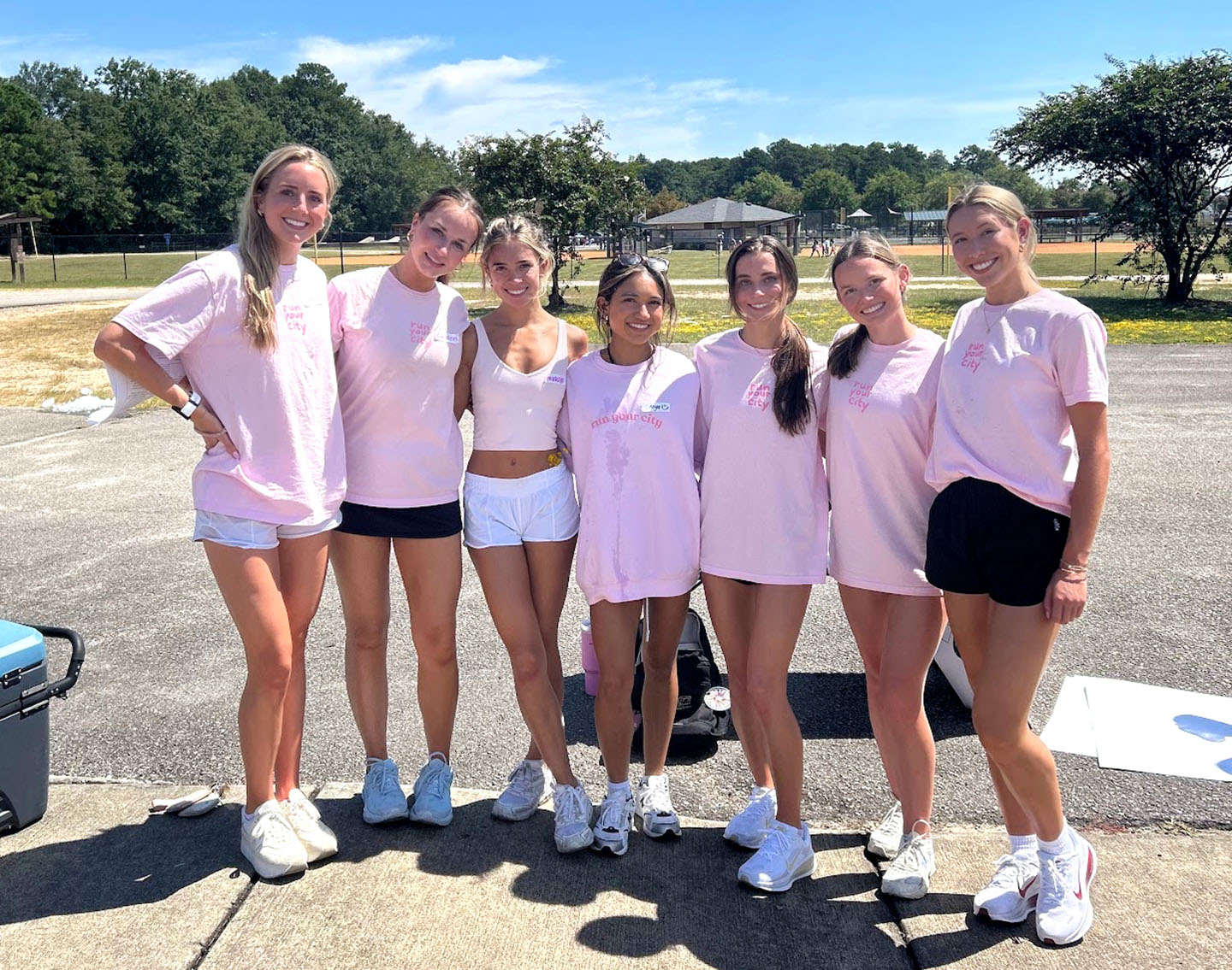 The executive team for Run Your City, Emma Torbert, left, Hayden Withers, Madelyn Gomez, Anya Arroyo, Cate Conklin, Caitlin Gemmill and Sofie Kurzawa, get together after practice one day to take a picture of the people behind the scenes. Photo courtesy of Caitlin Gemmill/The Carolina Reporter