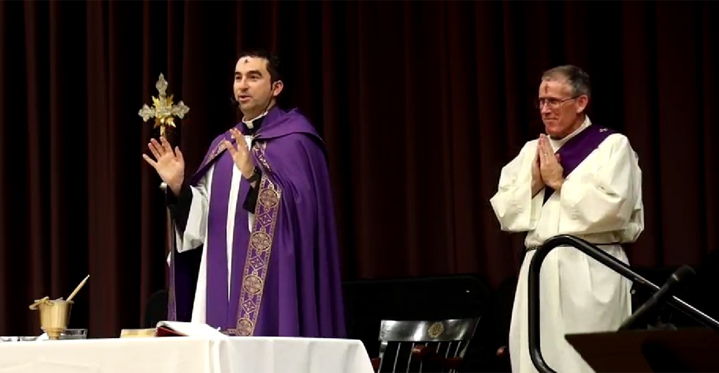 Father Rhett Williams and Deacon Steve Brown lead an Ash Wednesday service for USC students, offering prayers before the congregation as Lent begins. Photo by Amelia Gay/The Carolina Reporter