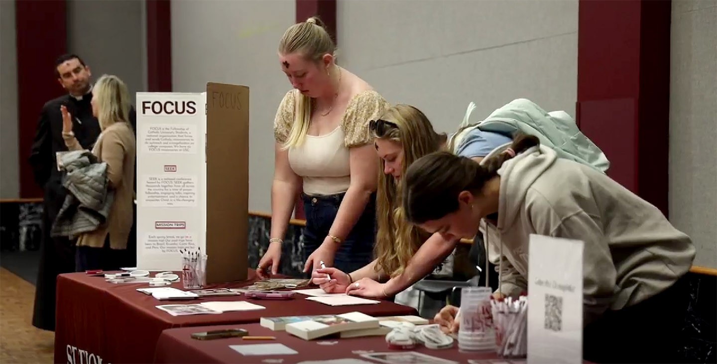 Students engage at an outreach table to learn more about participating after a service hosted by St. Thomas More Catholic Church on the University of South Carolina’s campus. Photo by Amelia Gay/The Carolina Reporter