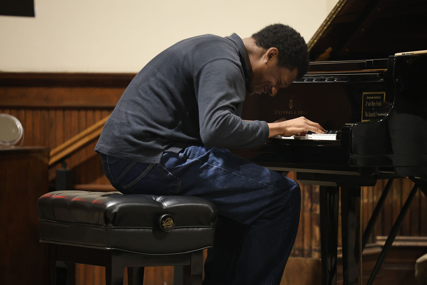 Sophomore jazz studies student Demarqus Moore plays piano at Greene Street United Methodist Church during Jazz Jam, a weekly gathering of jazz-lovers. Photo by Miles Shea/Carolina Reporter
