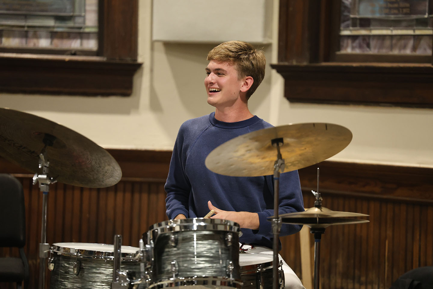 Sophomore jazz studies student Jackson Goldy, who specializes in drums, performs at Jazz Jam, a weekly gathering of student musicians. Photo by Miles Shea/Carolina Reporter