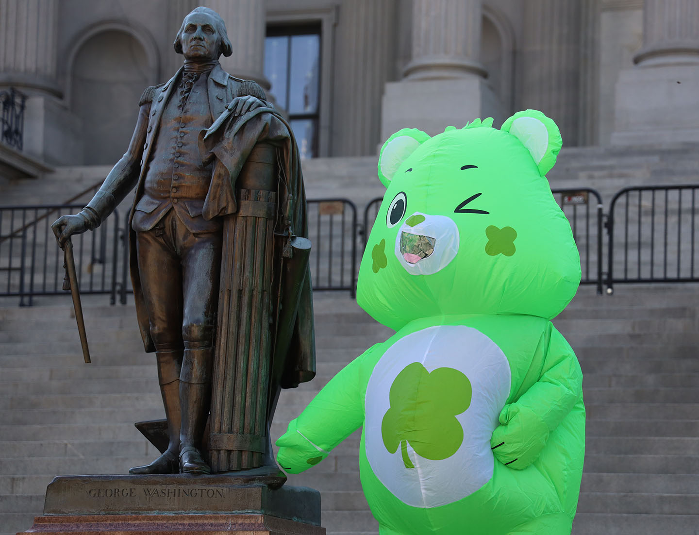 Steven Berning wore a Care Bear inflatable and was one of the first to arrive at the Statehouse on Saturday morning.