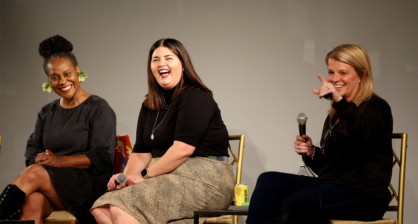 Christina Smith-Galloway, left, and Danielle Salley laugh as Courtney Speight talks about her creative journey at BlueCross BlueShield. Photo by Lacy Latham/The Carolina Reporter