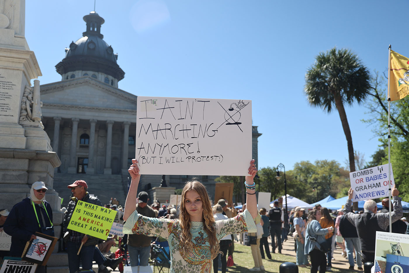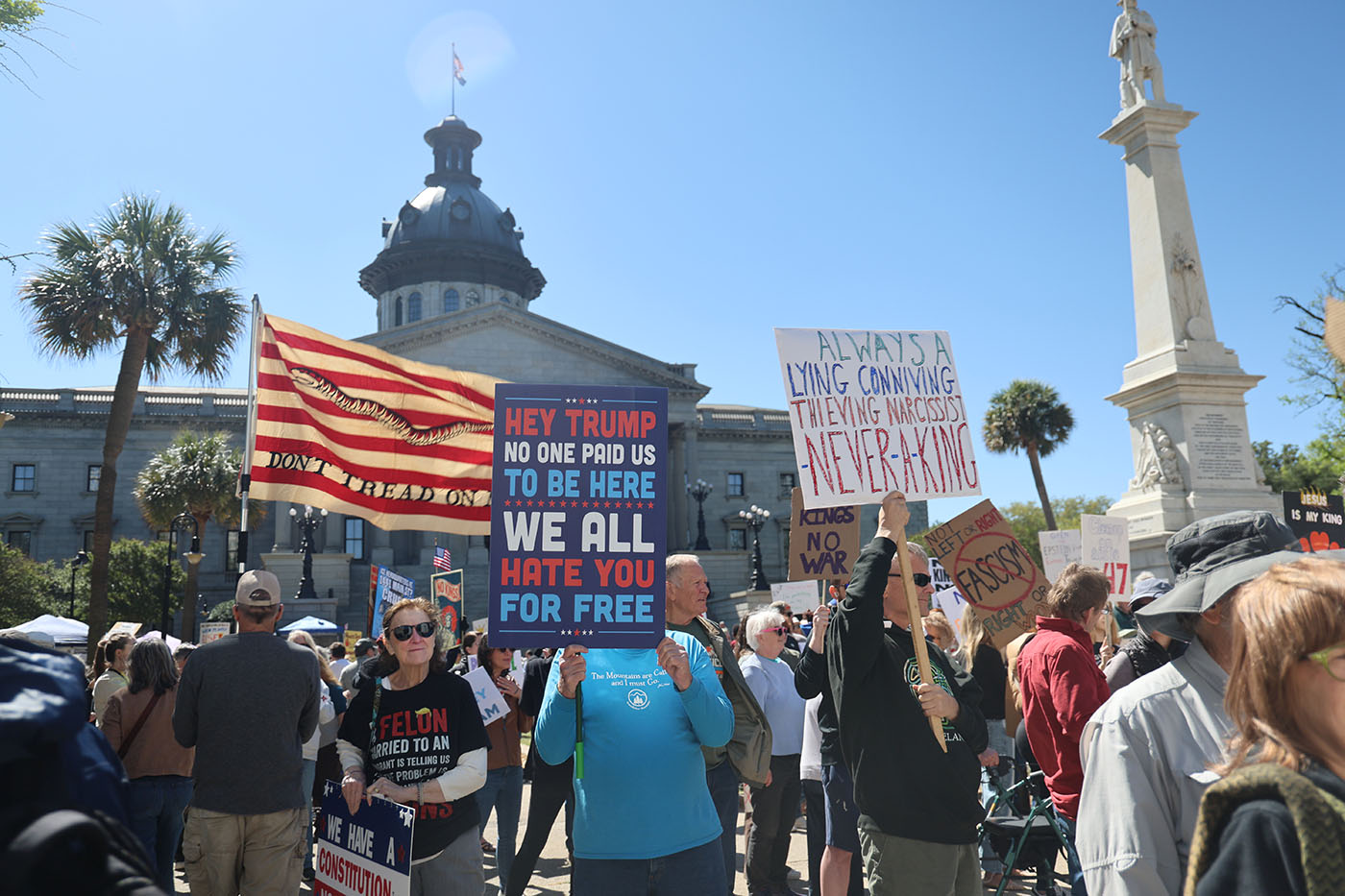 The national effort, part of a nationwide movement opposing what organizers describe as an abuse of executive power by the Trump administration, included more than 3,000 protests across the United States. In South Carolina, a reliably conservative leaning state, a passionate crowd still assembled in the capital.
