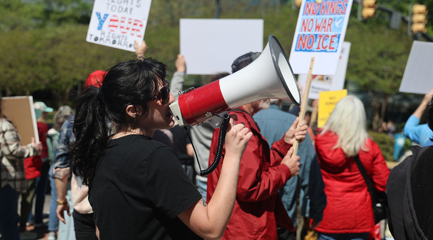 Quinnie Mustain leads the crowd in a chant, “Biggest threat in the world today: Donald Trump in the USA” facing Gervais Street in front of the South Carolina Statehouse. Photo by Julia Moulton/The Carolina Reporter