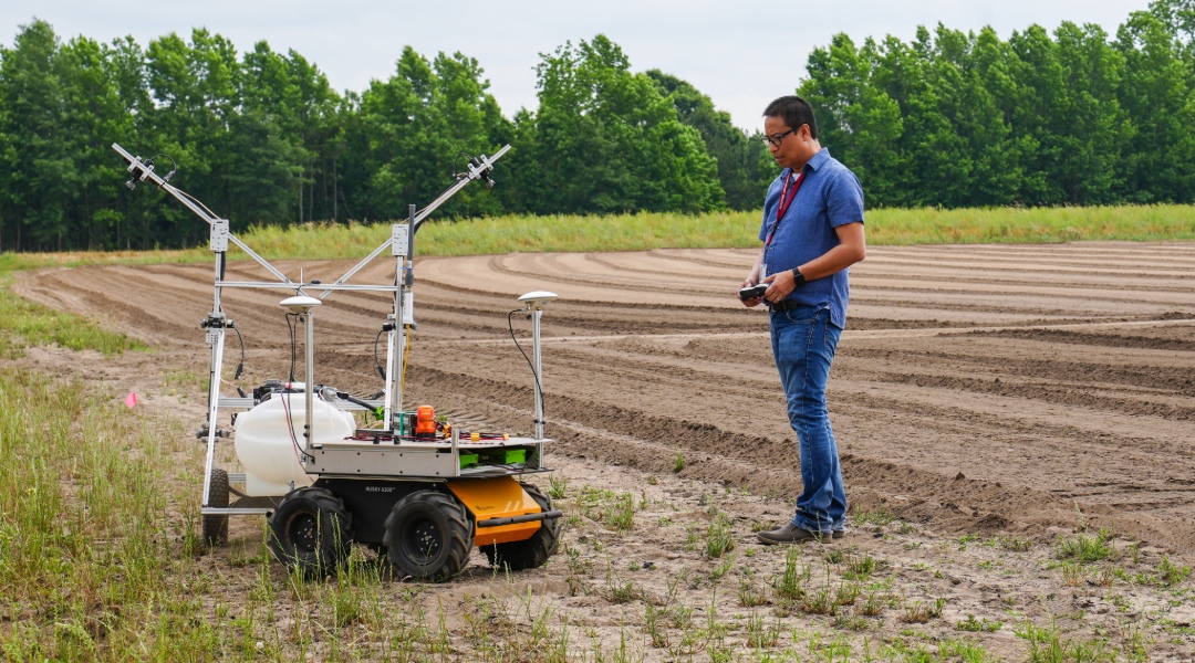 Joe Mari Maja tests a cotton-defoliant-sprayer robot at the Olar Research Farm in Bamberg County. (Photo provided by Joe Mari Maja/Carolina News & Reporter)