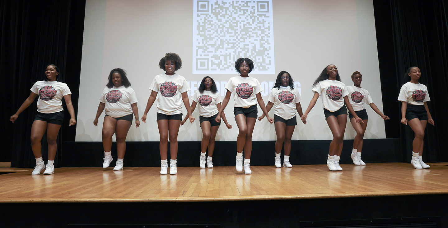 The University of South Carolina has a new, official stomp-and-shake team, the Storm. Naomi Moultrie, left, Jamya White and Imani Durham enjoyed The Storm’s recent performance. Photo by Payton Hamrick/The Carolina Reporter