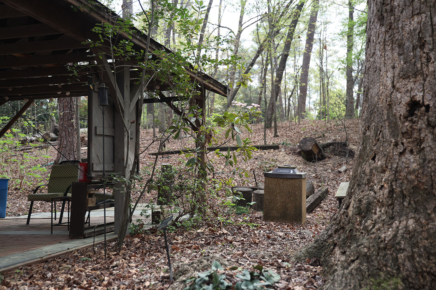 The 2024 inland storm knocked down 12 of the arboretum’s trees, including a large hickory, which fell on top of the Outdoor Classroom. Its stump remains visible behind the building. Photo by Sencere Rice/The Carolina Reporter