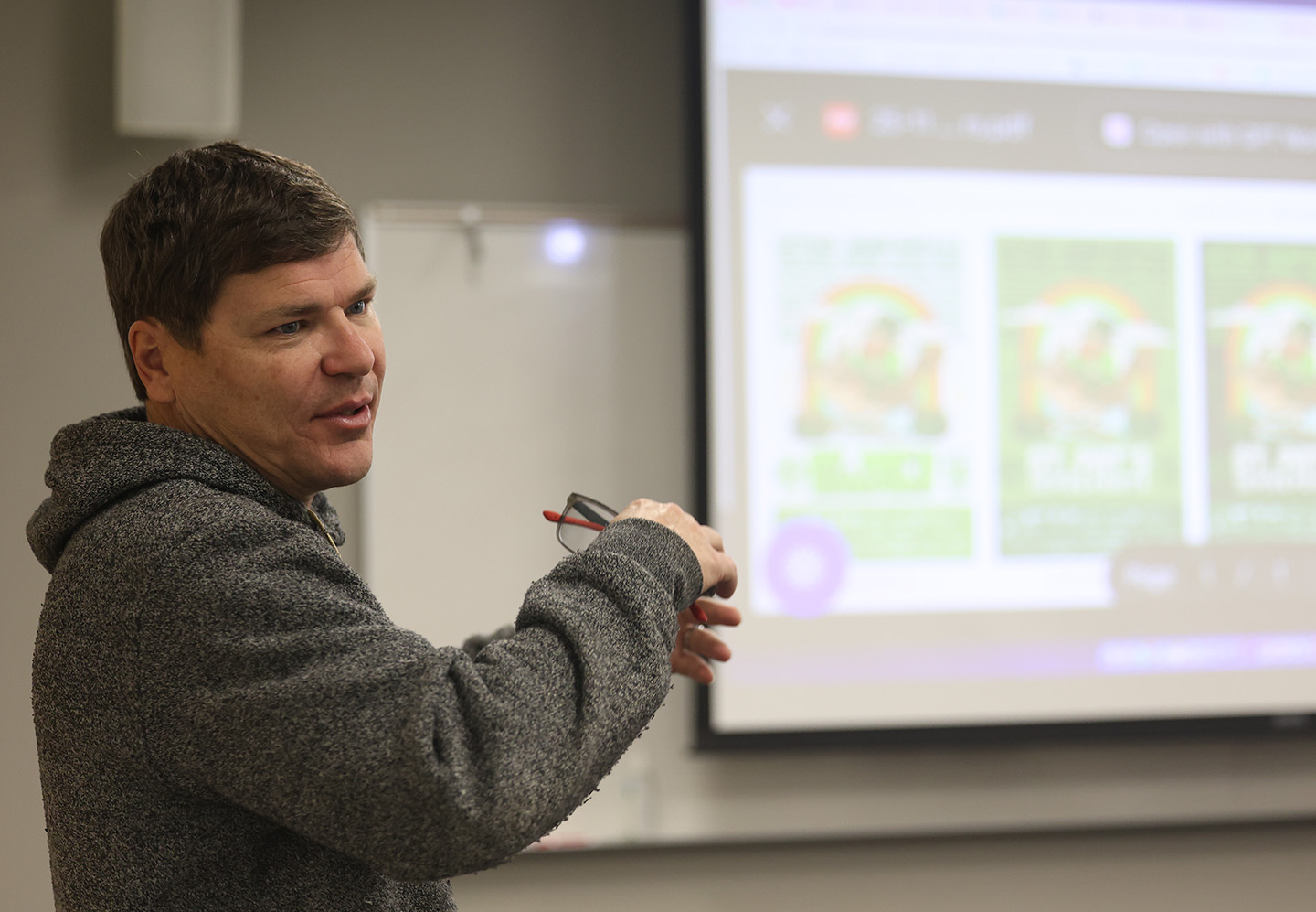 Trae Judy shows students flyer designs used for the annual St. Pat’s in Five Points festival. Photo by Erin Abdalla/Carolina Reporter