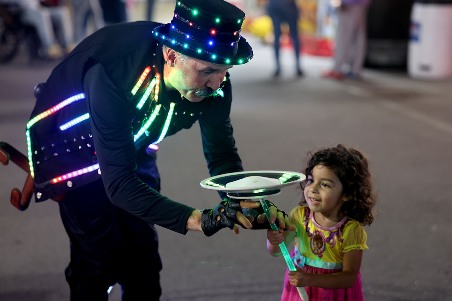 The Amazing Aydar entertains 3-year-old Nana Shepperdo who traveled from Aiken with her mother Jade to enjoy a day at the South Carolina State Fair. Photo by Miles Shea/Carolina Reporter