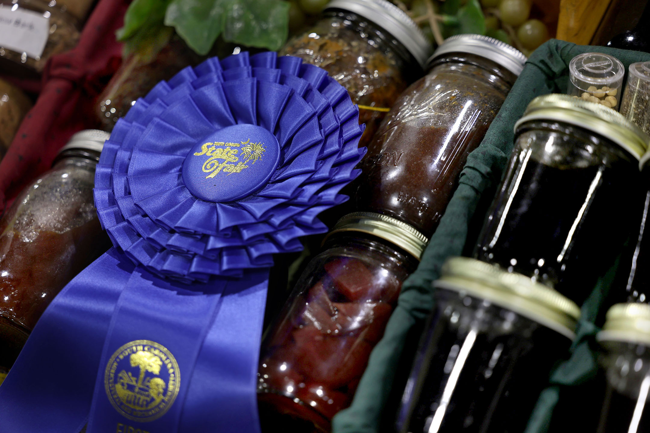 A blue ribbon winning display of canned fruits and vegetables sits neatly arranged in the agriculture building at the South Carolina State Fair. Photo by Giovanni Cusatis/Carolina Reporter